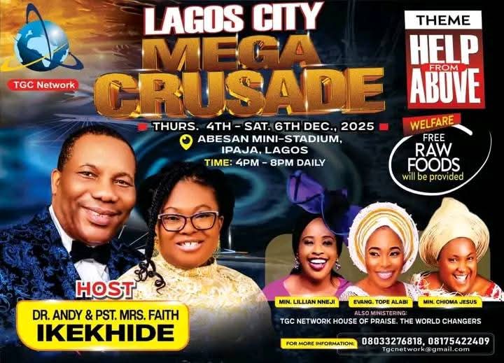 Hosted by Dr. Andy and Pastor Mrs. Faith Ikekhide, the Lagos City Mega Crusade promises to be a powerful convergence of faith, worship, and miracles. It is designed to inspire hope, ignite revival, and bring divine intervention to individuals and families across Lagos and beyond.