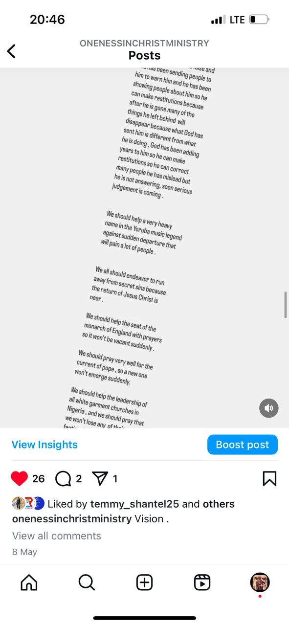 Sadly, popular prophet Kingsley Aitafo, Shepherd in charge of Oneness in Christ Ministry who released a prophetic warning about her demise in May 2024 expressed sadness about her demise. Despite the confirmation of his prophecy concerning her the clergy sympathise with the family and pray God comfort the family.
