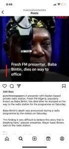 Sadly, a presenter with Ibadan-based private radio station, Fresh FM Nigeria, popularly known as Baba Bintin, has died after he slumped on his way to the radio station for his programme on Saturday.