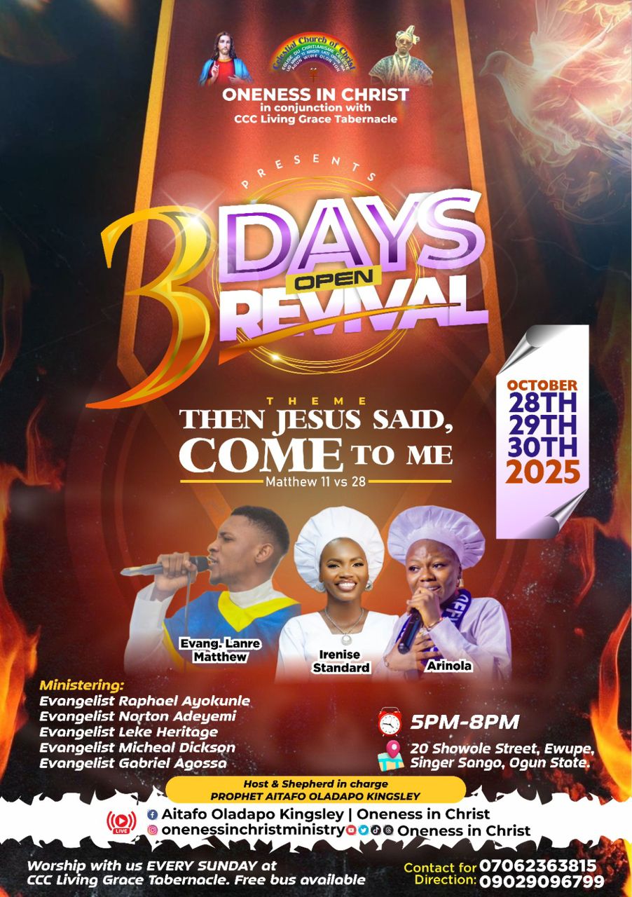 Under the dynamic leadership of Prophet Aitafo Oladapo Kingsley, this revival is themed “Then Jesus Said, Come to Me” (Matthew 11:28) — a direct invitation from the Master Himself to all who are weary and burdened, offering rest, restoration, and revival.