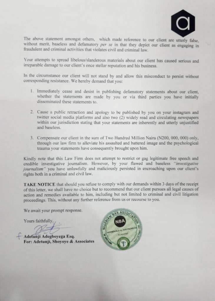 He has also requested that a retraction and public apology be made, alongside a compensation of N200,000,000 for the assault within three days.