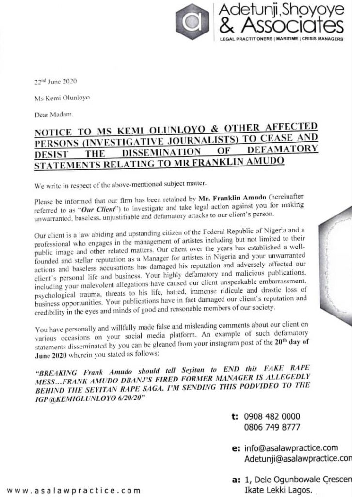 Also, Franklin Amudo has denied being the sponsor of the allegations on the successful musician, adding that Kemi Oyuloyo and anyone that continue to accuse him wrongly will be faced with a law suit.