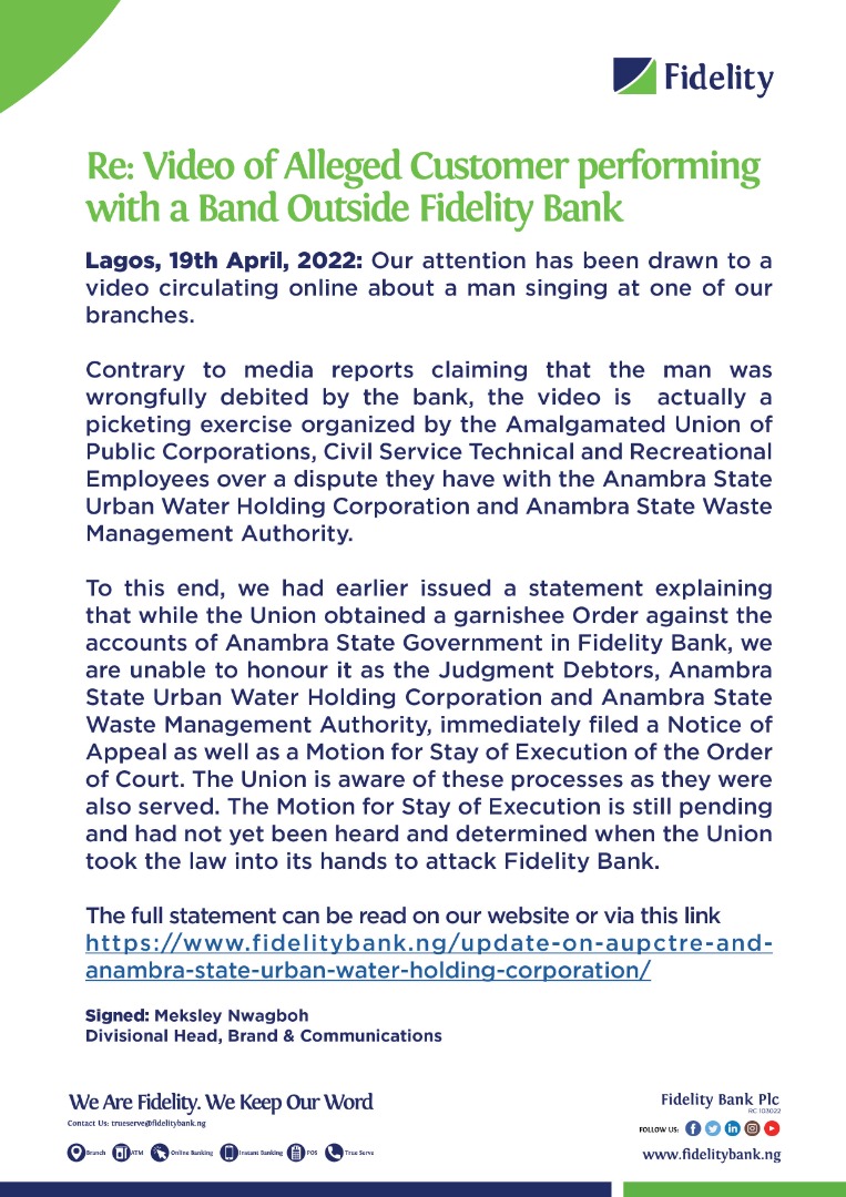 The full statement can be read on our website or via this link https://www.fidelitybank.ng/update-on-aupctre-and-anambra-state-urban-water-holding-corporation/