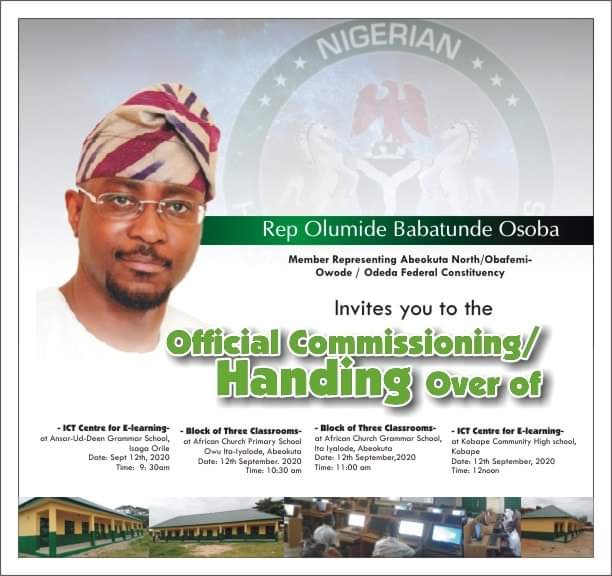 And as if that’s not enough, the quiet federal lawmaker is set to commission another set of educational projects built across the length and breadth of his federal constituency. Top on the list of educational projects billed for commissioning and official handing over tomorrow, September 12, 2020 include – Block of Three Classrooms at African Church Primary School, Ita-Iyalode, Abeokuta. Others include Block of Three Classrooms at African Church Grammar School, Ita-Iyalode, Abeokuta, ICT Centre for E-learning at Kobape Community High School, Kobape. Also billed for commission is another well-equipped ICT Centre for E-learning located at Ansar-Ud-Deen Grammar School in Isaga – Orile.