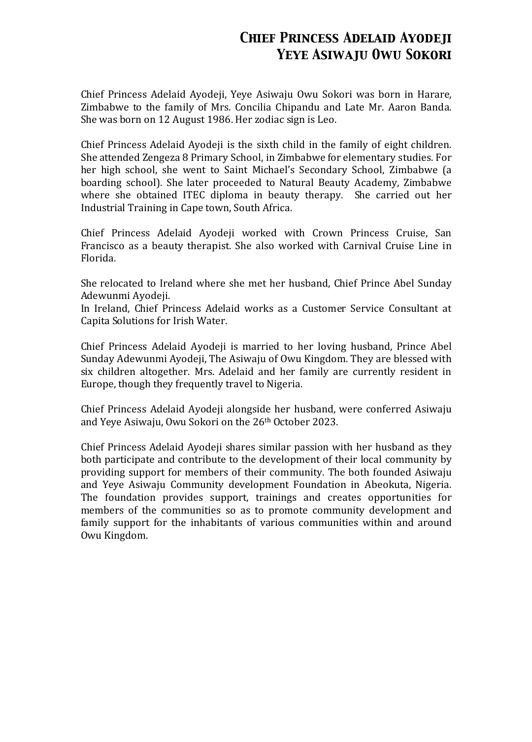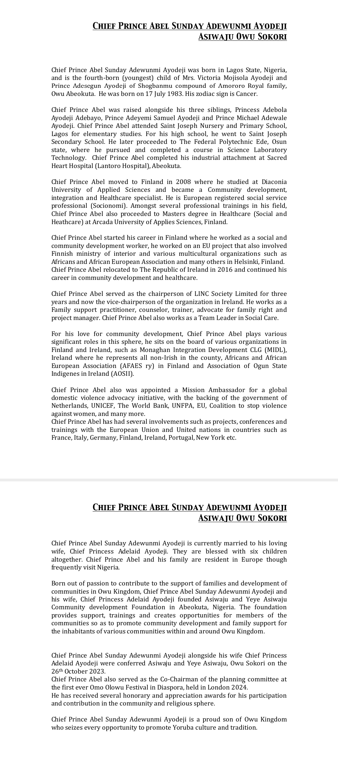 Republic of Ireland Based Bizman, Wife bag Asoju Oba, Yeye Asoju Oba titles of Owu Kingdom
