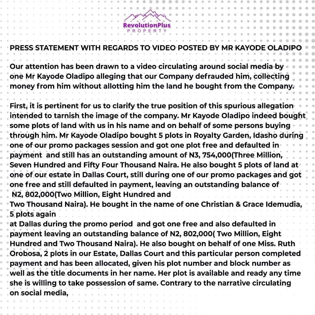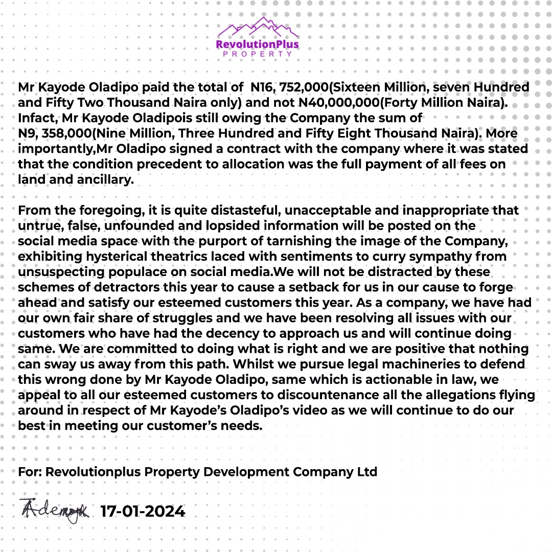 Revolution Plus Property Limited has dismissed an allegation of 40million plots of land fraud made by one of its Customers, Mr. Kayode Oladipo.