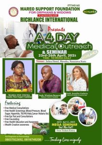 In a bid to improve the health and well-being of vulnerable communities, particularly widows and orphans, the Mareo Support Foundation (MSF), a non-governmental organization, has partnered with Richlance International to organize a four-day free medical outreach in Masaka, Nasarawa State.