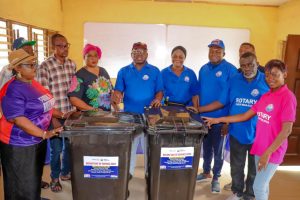 Another high point of the project was the Donation of two giant waste Bins to Olusosun community. PAG Tonnia Taiwo , Chief of Staff to the District Governor presented the gifts on behalf of the Clubs to the School Management ably represented by Mrs. Olaniyan Odunmorayo Lizzy, the head teacher.