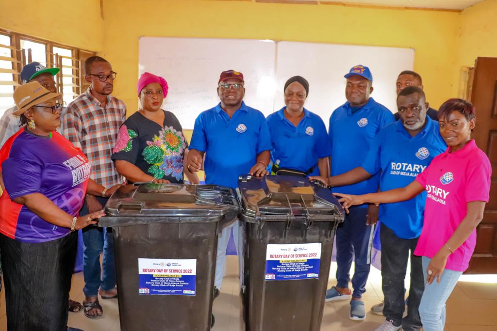 Another high point of the project was the Donation of two giant waste Bins to Olusosun community. PAG Tonnia Taiwo , Chief of Staff to the District Governor presented the gifts on behalf of the Clubs to the School Management ably represented by Mrs. Olaniyan Odunmorayo Lizzy, the head teacher.