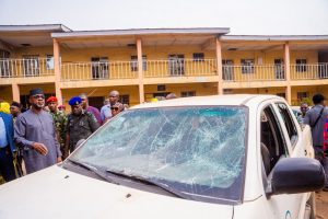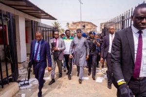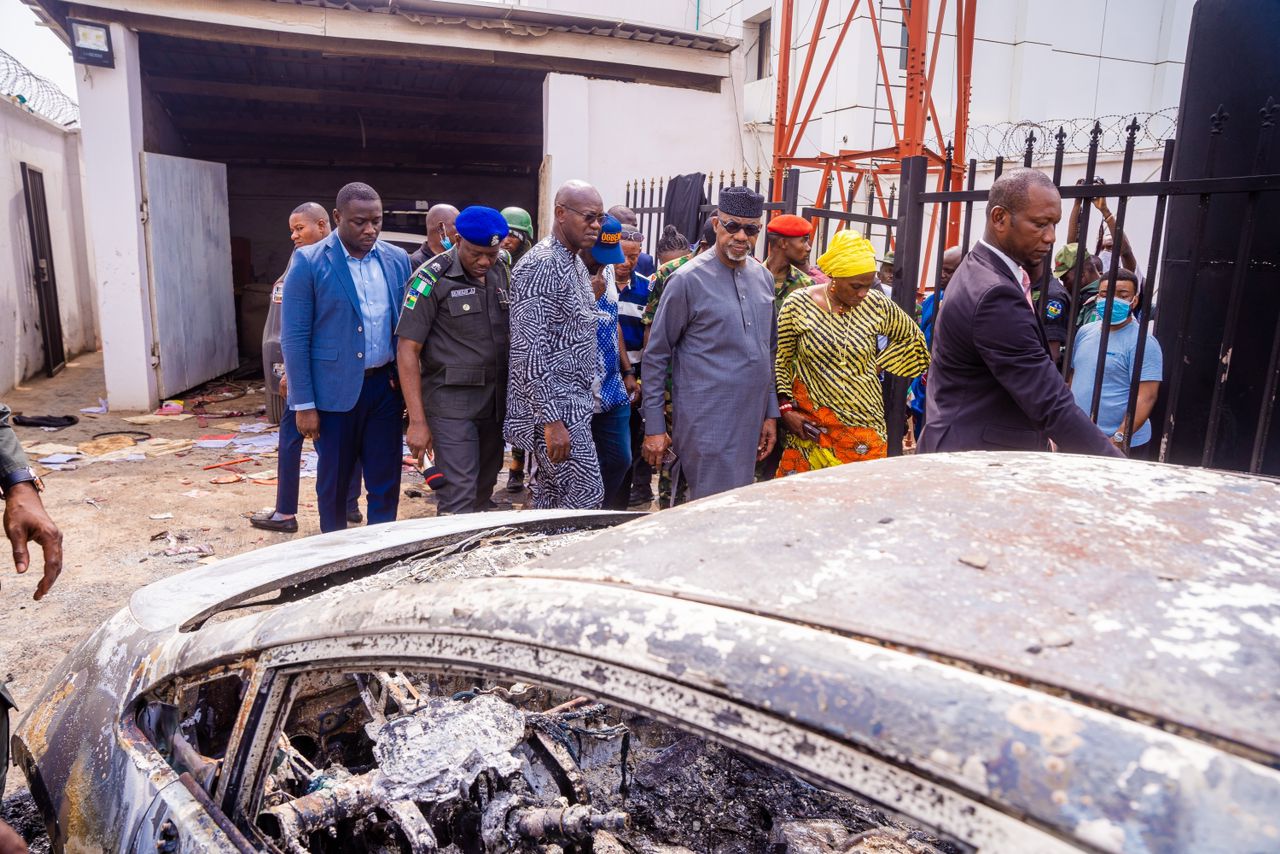 SAGAMU RIOT– Following the violent protests that rocked Sagamu on Monday over the scarcity of the new naira notes, the Ogun State governor, Dapo Abiodun, on Tuesday, visited Sagamu for on-the-spot assessment of buildings and property affected by the unrest, with a declaration that the state government would go after those involved in the arson and wanton destruction of the public property.