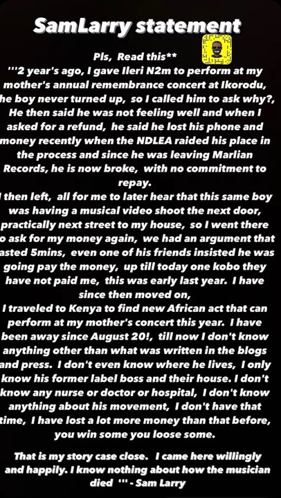 2 years ago, I gave Ileri N2m to perform at my mother’s annual remembrance concert at Ikorodu, he boy never turned up, so I called him to ask why?, He then said he was not feeling well and when I asked for a refund, he said he lost his phone and money recently when the NDLEA raided his place in the process and since he was leaving Marlian Records, he is now broke, with no commitment to repay, then left, all for me to later hear that this same boy was having a musical video shoot the next door, practically next street to my house, so I went there to ask for my money again, we had an argument that lasted 5mins, even one of his friends insisted he was going pay the money, up till today one kobo they have not paid me, this was early last year. I have since then moved.