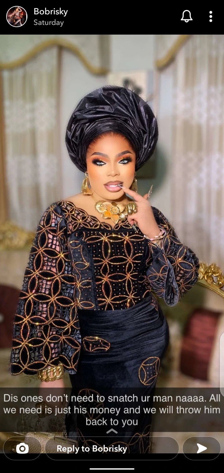 Bobrisky wrote: “This one doesn’t need to snatch your man naaaa. All we need is just his money and we will throw him back to you”