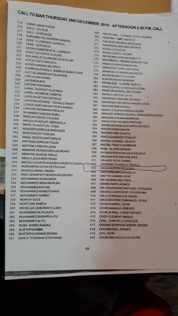 I decided to call out Sahara Reporters now because I have done my personal finding. Against the half-baked, poorly planned and hare-brained investigation it says it carried out, my finding shows that Obasa was actually called to bar and possesses a certificate with number 050879. In fact, Obasa was number 403 on the roll of those called to bar by the Body of Benchers chaired by Chief George N. Uwechue, a Senior Advocate of Nigeria (SAN). The evidence are here added to this piece. He has been certified by the body of benchers.