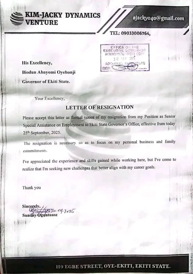 The two letters by Oguntuase and Ogunleye dated September 25, 2025 and October 1, 2025 respectively which were addressed to the Governor, cited personal reasons and family commitments as rationale behind their actions.
