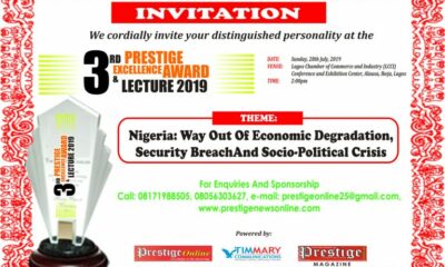 All is set for 2019 Prestige Excellence Award and Lecture slated for Sunday, July 28, 2019 at Lagos Chamber of Commerce and Industry (LCCI) Conference and...