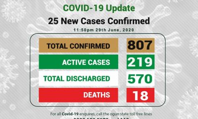 As at 29th June, 2020, Ogun State had discharged a total of 570 COVID-19 cases, including the 31 discharged on the day alone. Sadly however, 25...