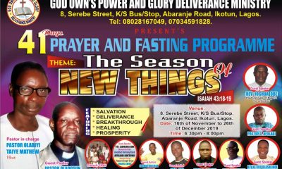 It will be 41 days of prayers and fasting beginning from Saturday November 16, to December 26, 2019. According the Head Pastor of the Absence, Ikotun...