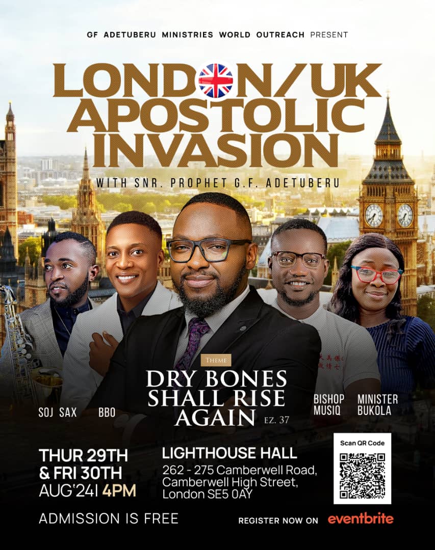 Snr Prophet GF Adetuberu, a man after God’s heart and with a mission to transform lives with his unique calling as a prophet of God, is set to storm the city of London for a life-changing experience at the London/UK Apostolic Invasion tagged DRY BONES SHALL RISE AGAIN. It will be held at Lighthouse Hall 262-275 Camberwell Road, Camberwell High Street London SE5 0AY on the 29th & 30th of August, 2024.