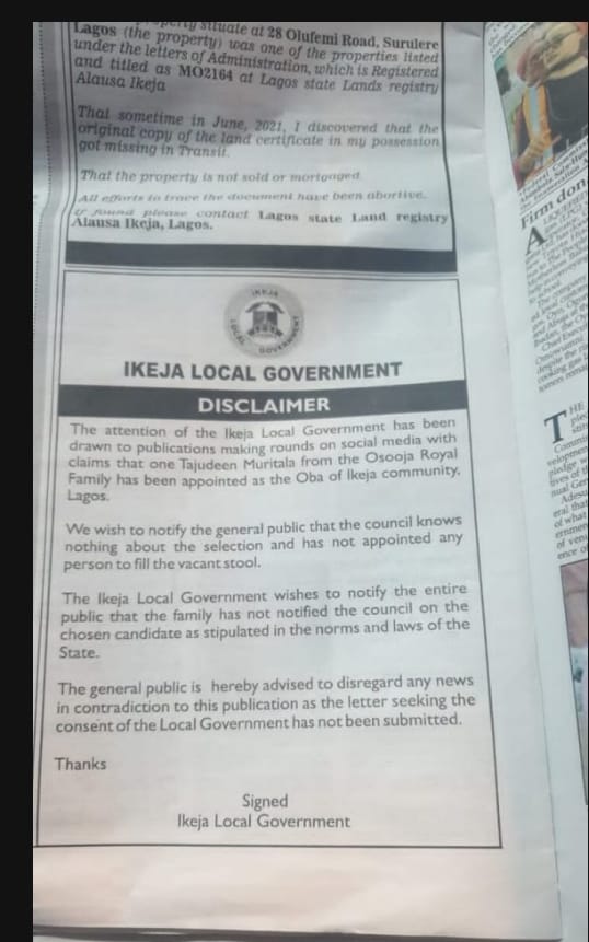 Ikeja indigenes lamented the development and also use the medium to refer to the present monarch crisis in Oshodi too.