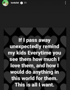 “If I pass away unexpectedly, remind my kids every time you see them how much I love them, how I would do anything in this world for them. This is all I want,” the post read.