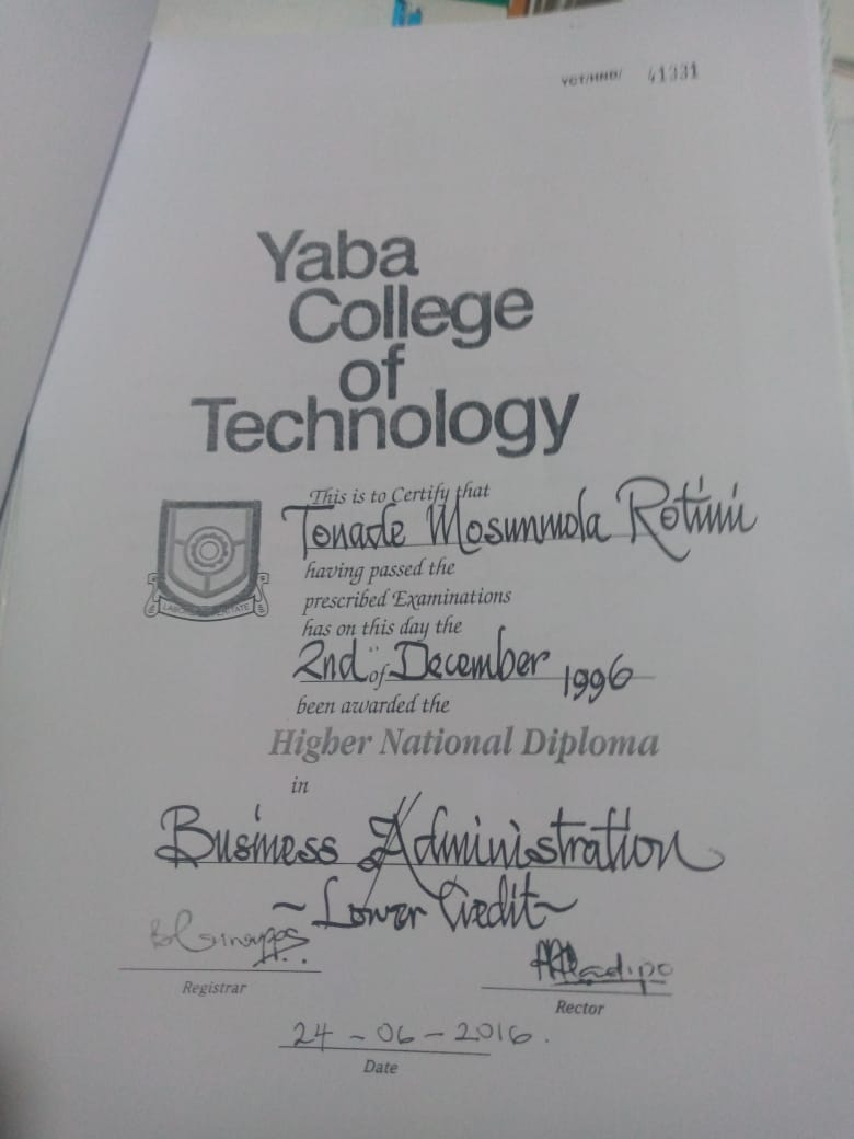 But contrary to her claim that she attended Yabatech for her HND, there was no record at all at the higher school of learning that she graduated at the school.