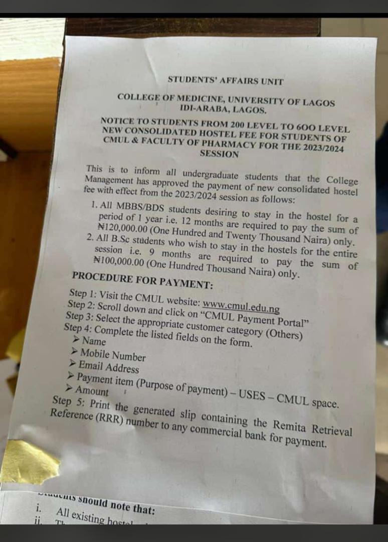 In addition, the school has increased accommodation fees for undergraduates to about 400 percent, from N25,000 to N100,000, while medical students would pay N120,000.