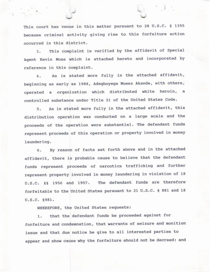 The U.S. government had in July 1993 sought forfeiture of proceeds of narcotics Mr Tinubu was accused of laundering. The matter was resolved in a compromise between the Tinubus and the U.S. authorities, with the Tinubus being asked to keep the money in the Heritage Bank account while the $460,000 in the Citibank account was forfeited.