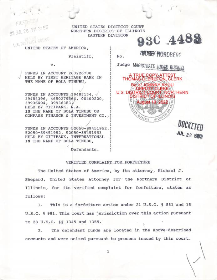 The United States District Court for the Northern District of Illinois has released fresh documents holding Bola Tinubu’s encounter with American authorities over allegations of narcotics trafficking and money laundering.