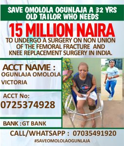 An active indigene of Ogun State, Omolola Ogunlaja who had an accident while on the field of work 3 years ago and who’s required to undergo a surgery on non union of the femoral fracture and knee replacement surgery in India with the sum of 15 million naira has actually received the sum of #500,000 from the Ogun state government.