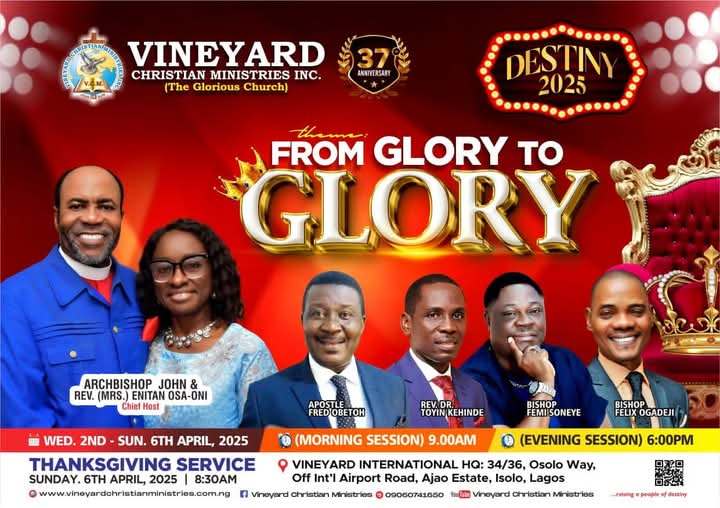 The Vineyard Christian Ministries INC, Aka “The Glorious Church”, is preparing for a momentous celebration of its 37th Anniversary alongside its annual “From Glory to Glory” program. The five-day spiritual event will take place from Wednesday, April 2nd to Sunday, April 6th, 2025, at the ministry’s international headquarters located at 34/36 Osolo Way, Off International Airport Road in Ajao Estate, Isolo, Lagos.