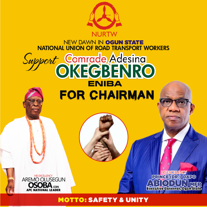 ‘’I am using this medium to tell all NURTW members across the state that i Comrade Adeshina Okegbenro (ENIBA) is contesting for the position of NURTW Chairman Ogun State Chapter and i am ready to bring transformation to the union’’