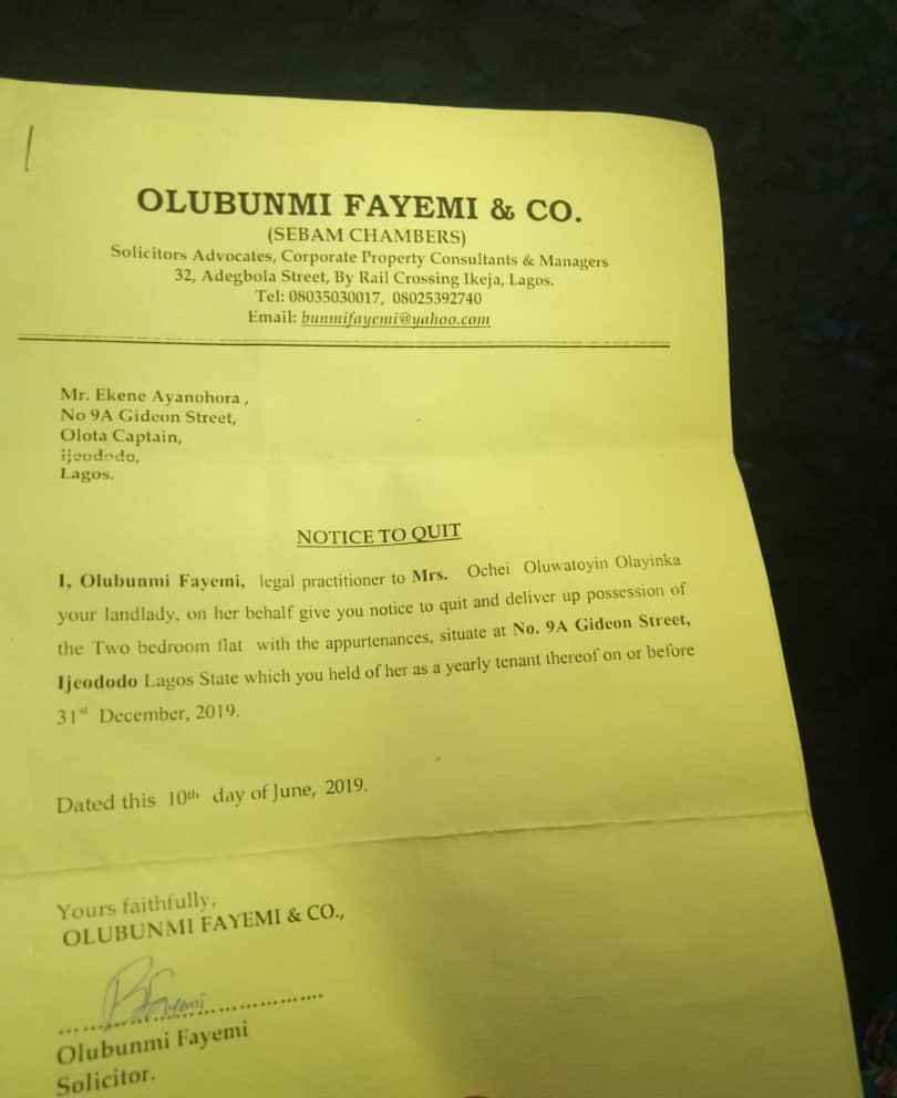 “In October 15th, I received another quit notice from her lawyer, I had to inform my own lawyer who called her lawyer to know why sending series of quit notices while my rent has not be expired, notwithstanding I just packed in few months earlier.