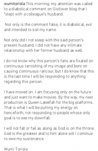 “This morning, my attention was called to a diabolical comment on Gistlover’s blog that I slept with a colleague’s husband.