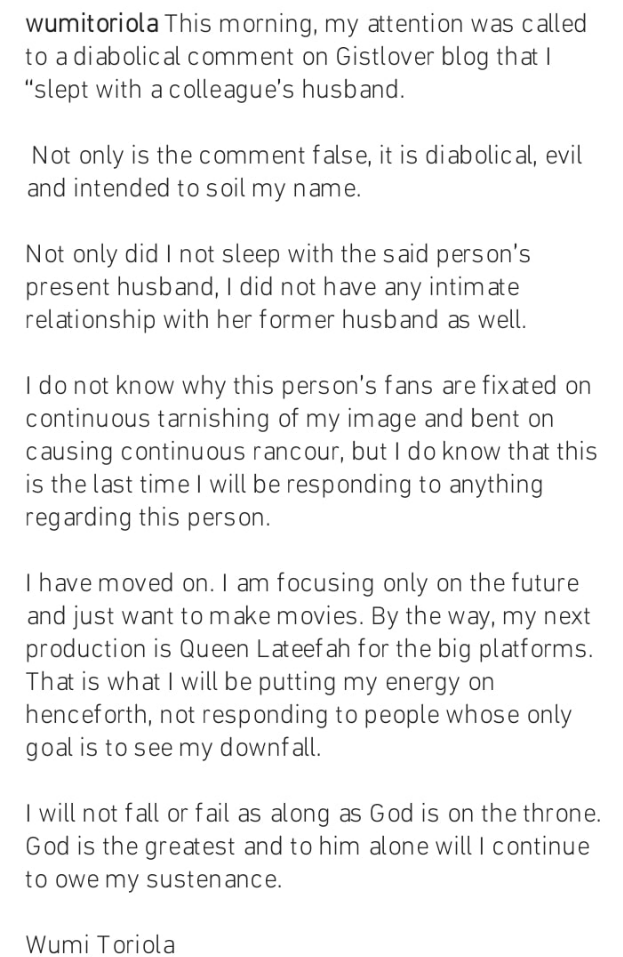 Reacting to it, Wumi Toriola via a lengthy post on her Instagram page shut down the report.