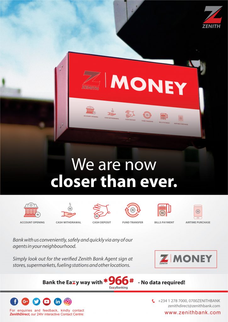 Nigeria’s leading financial institution, Zenith Bank Plc, has introducedZ-Money, which brings banking services closer to its customers and enhance financial inclusion among the under-banked and unbankedpopulace of the country.Z-Money is an agency banking product of the bank which entails theonboarding of agents who are expected to render basic financial services on behalf of the bank. Through the bank’s network of agents spread across the urban andrural communities in the country, customers are able to openaccounts, deposit cash into any account, withdraw cash from any bankaccount, transfer funds, buy airtime, pay bills, and do so much more ina convenient way. In order to engender trust among its customers, theBank ensures that all transactions done through the agents are PINprotected and safe.Commenting on the new product, the Group Managing Director/ChiefExecutive of Zenith Bank Plc, Mr. Ebenezer Onyeagwu said “the bankremains focused on providing premium financial solutions that createvalue for its customers wherever they are located across the country”.He added that apart from helping to extend the bank’s retail reachacross all segments of the market, the adoption of the agency bankingplatform also demonstrates the bank’s commitment to achieving financial inclusion in the country.Zenith Bank Plc is recognized as one of the most innovative financial institution in Nigeria and was voted the most customer-focused bankin Nigeria for the Retail and SME segments in the 2018 KPMG AnnualBanking Industry Customer Satisfaction Survey (BICSS). The bank’s commitment to world-class service standards has led toseveral product innovations over the last few weeks including the“Zenith Timeless Account”, which allows Nigerians aged 55 years andabove bank for free, the “Zenith Save4me”, a high interest targetsavings account and “Dubai Visa Service” on the Zenith Internet Banking Platform, which allows convenient application and payment for visas to Dubai